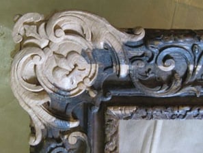 Detail der Restauration vom Rahmen Tableau mécanique, Antoine Watteau zugeordnet